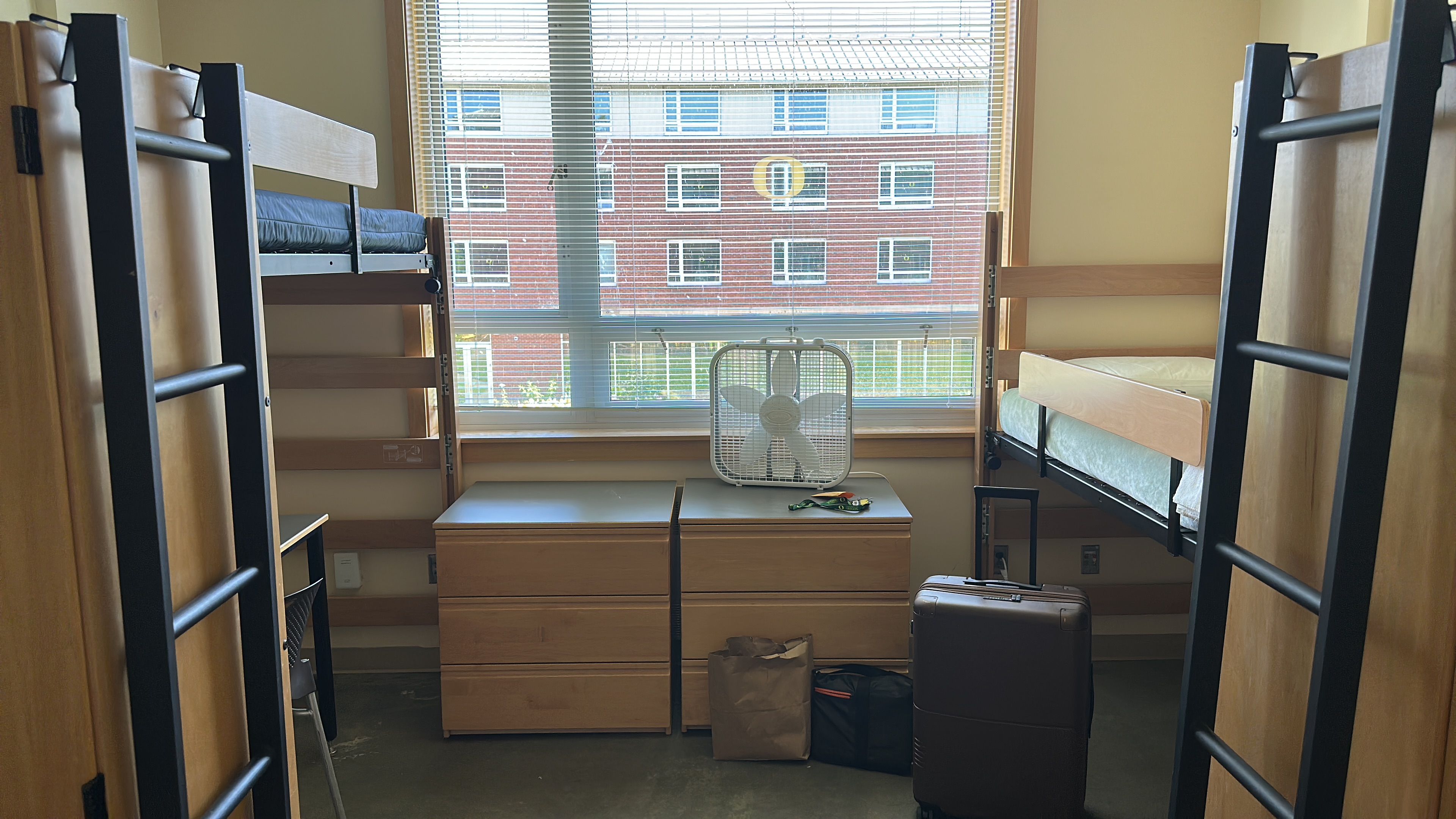 July the 4th was the day I arrived, which explained why I saw a considerable number of pedestrians donning American flag-printed t-shirts. (I later realised that this particular kind of decoration is not in fact localised to Independence Day.) In perhaps an appropriately American fashion, I was taken to Walmart that day by my new friend (the aunt of my friend) to acquire some meantime underwear. They had just what I needed: 20-packs of underwear, SIM cards, eighty-six varieties of pound-sized bags of crisps, and high-powered hunting crossbows. Here I think I'd been awake for about thirty-two hours, and I was really dizzy. Unfortunately I slept quite poorly that night, getting perhaps six our so hours of sleep, although my suitcase did show up during that time which I appreciated. The next day I headed to the U of O campus to deliver my things to the dorm, pictured below, where I stayed for five weeks.